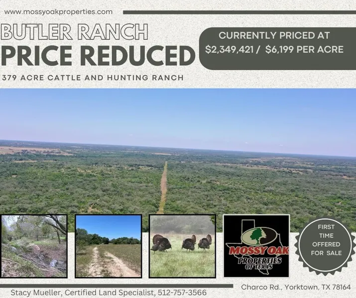 Don't miss this rare chance to own 379 contiguous ag-exempt acres just outside Yorktown, TX. The Butler Ranch has been in the same family since the 1800s and is teeming with wildlife, offering year-round hunting opportunities. You’ll find a variety of game, including white-tailed deer, wild turkey, feral hogs, squirrels, rabbits, dove, quail, and an occasional flock of ducks. A seasonal creek runs through the property, typically holding water throughout the year, providing an opportunity for fishing.