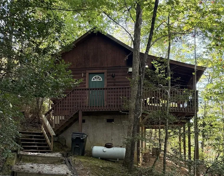 This charming log cabin, set on 0.33 acres just minutes from downtown Bryson City, is tucked away among the trees and designed like an open studio. Currently serving as a vacation rental, it comes fully furnished and features a full kitchen, inviting living space, and bedroom area with its own private bathroom. The covered front porch offers a hot tub along with ample room to unwind or host guests.