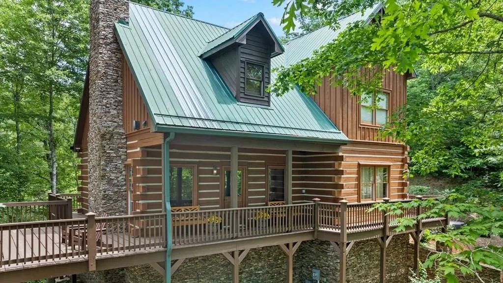 This stunning 3-bed, 3-bath cabin in the peaceful Wildflower community offers long-range, parkway-like views and rustic charm with modern comforts. The main level features a great room with a fireplace, custom rustic kitchen cabinetry, a dining area with a handcrafted table, a primary bedroom, and a recently renovated full bath. The walk-out basement is an entertainer's dream, complete with a living area with a fireplace, TV center, curated furnishings, and a WNC Billiards pool table. A bonus room and full bath add versatility. Outside, enjoy a hot tub and tranquil water feature. Wildflower offers a clubhouse with stunning views, a full kitchen, pool, gathering space, and exercise room. Conveniently located 23 minutes from Franklin, 30 minutes from Sylva, and within a short drive to Asheville, Atlanta, and Greenville airports. Don't miss this serene mountain retreat—schedule your showing...