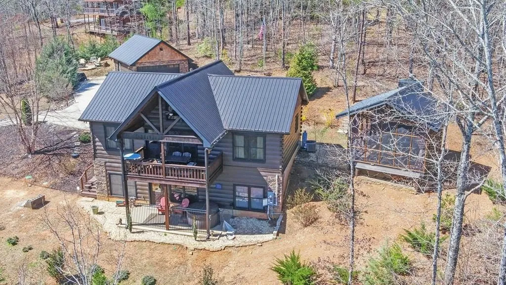 Listed below Appraisal. Escape to your dream mountain getaway with this stunning Turn Key cabin, perfectly situated just minutes from Blue Ridge, GA, Copperhill, TN, McCaysville, GA and the Ocoee River. Offering breathtaking long-range mountain views and luxurious amenities, this property is an ideal choice for family retreats or as a high-income rental investment. Relax in style with an open floor plan featuring a cathedral, tongue and groove ceiling, and a cozy stone fireplace. Each of the 2 primary suites is designed with your comfort in mind. Step outside to soak in the unobstructed mountain views from the large deck. Unwind in the hot tub while taking in the serene beauty around you. Step downstairs the recently Keith Sumner designed den that doubles as a game room, complete with a beverage bar. This level also includes 1 bedroom, a bunk room, a full bathroom, and a private deck—perfect for a kids' area or additional guest space. Host unforgettable gatherings on the separate enclosed party porch, featuring a wood-burning fireplace and a dining area. Outside, enjoy evenings by the fire pit as you take in the cool mountain air. A 2-car garage provides plenty of space for parking and storage. This property is not just a home; it's an experience. From the cathedral ceilings and stone fireplace to the outdoor hot tub and fire pit, every detail is designed to create lasting memories. Whether you're enjoying a private family getaway or hosting guests for rental income, this cabin is a mountain retreat like no other.
