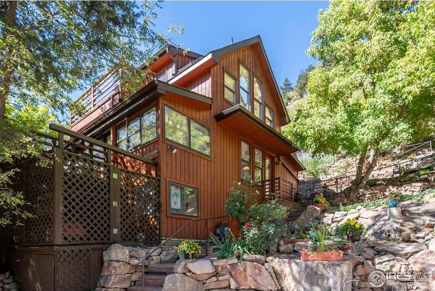 Perched above the canyon, with stellar views, in coveted Eldorado Springs, this charming light-filled home offers an exceptional blend of serenity and access to the outdoors, in one of Boulder County's most sought-after areas. Set amongst delightful, tiered gardens with mountain views, the home lives like a private getaway just moments from South Boulder. The interior has been freshly painted and has newly refinished wood floors in the kitchen and entry, while walls of windows bring the outdoors in. The open concept main level features a living room with a cozy fireplace, dining area, kitchen, and a remodeled bathroom with a walk-in shower. The lofted primary bedroom serves as a true sanctuary with a private balcony, generous walk-in closet and half bath. The basement has great space for an art studio or workshop. The exterior is freshly stained and there are two dedicated parking spaces in front of the home. Double lot allows you to relax in peaceful solitude on the one of the lovely flagstone patios surrounded by colorful perennials. Enjoy easy access to surrounding parks and trail systems for hiking, cycling, trail running, and climbing. Life in Eldorado Springs is amazing, defined by its natural beauty with access to the iconic, spring-fed Eldorado Springs outdoor pool. All of this is less than a ten-minute drive to South Boulder amenities including Whole Foods and the South Boulder Recreation Center, offering privacy and convenience in a truly special location.