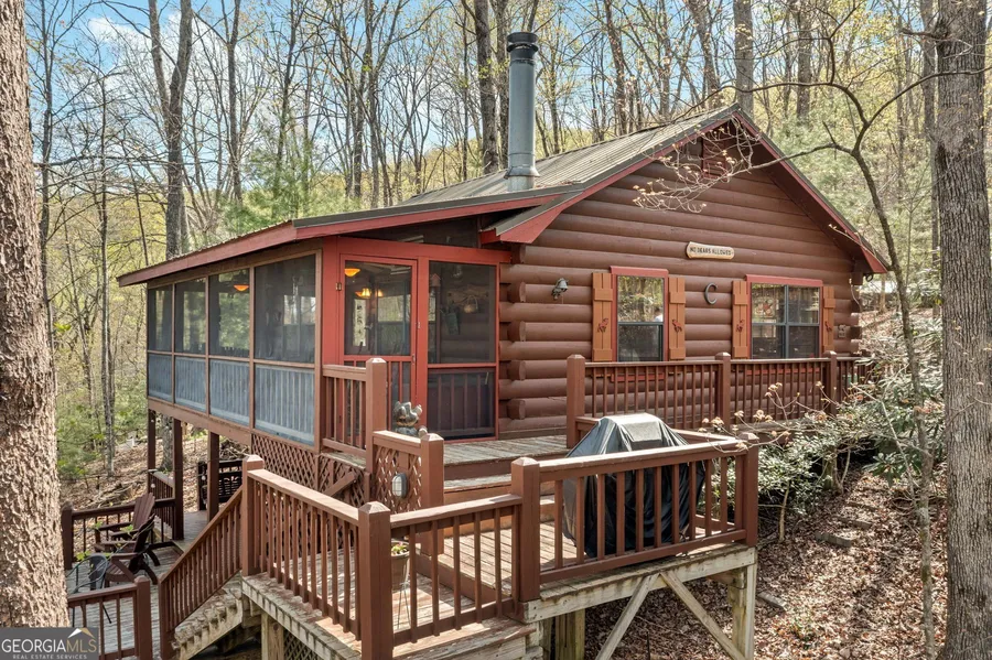 Bears allowed!!! Come to the North Georgia mountains to hibernate in your own Sisson built log cabin that has been well maintained and meticulously cared for. One family-owned cabin was used only as a part-time residence! Here, you will feel invited to unwind on multiple outdoor decks, to enjoy the serene surroundings. This home is located within the sought after Laurel Ridge community. Enjoy the long weekends listening to the birds on the screened-in back porch situated on a private lot just under 1 acre. Cuddle up to a cozy fire on a crisp spring night outside with one of the two fire pits or inside snuggled in front of the floor to ceiling stacked stone, wood burning fireplace. As you enter you are greeted by an open concept of living, dining and kitchen space. The eat-in kitchen easily seats 4-6! The kitchen is fully functionable with lots of cabinets and a full-sized pantry closet f...