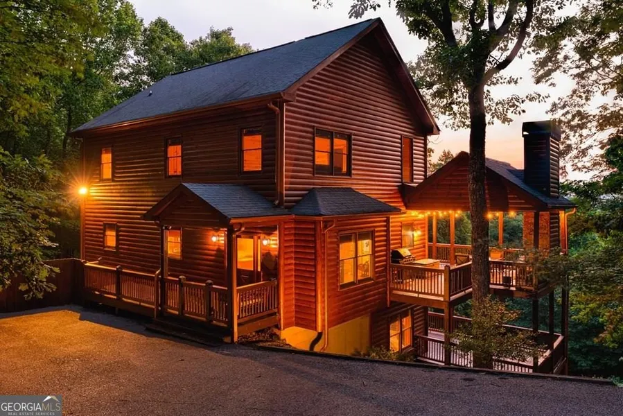 Million-Dollar Year-Round Views in Sought-After Mountain High. Enjoy sweeping, unobstructed long-range views from this stunning mountain retreat in the coveted Mountain High community-renowned for upscale homes, all-paved roads, and truly breathtaking vistas. This classic cabin masterfully combines rustic charm with refined comfort and a layout perfect for both entertaining and quiet relaxation. The open-concept main level features hardwood and tile floors throughout, anchored by a cozy gas log fireplace. The chef's kitchen is a standout with granite countertops, custom cabinetry, stainless steel appliances, a breakfast island, and a charming dining nook. Step out onto the expansive covered porch to take in panoramic views by the warmth of the outdoor fireplace. A spacious main-level bedroom suite offers double vanities, a jetted tub, tiled shower, and walk-in closet-plus the convenience of a nearby laundry room and pantry. Upstairs, the large open loft (complete with a pool table and dramatic wall of windows) leads to a luxurious master suite featuring its own fireplace, private balcony, spa-like bath with jetted tub, tile shower, granite counters, and a walk-in closet. The finished terrace level is built for fun and functionality, boasting a wet bar, game area, third fireplace, full bath with tub/shower combo, and an additional bedroom. Outdoor living is easy with multiple decks and a usable yard-ideal for gatherings or simply enjoying the mountain air. An adjacent lot is also available for purchase-perfect for added privacy or future expansion. Short-term rentals are allowed, making this an excellent investment opportunity or full-time escape.