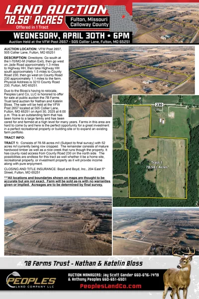 Due to the Blosss having to relocate, Peoples Land Co, LLC is honored to offer for sale at public auction the 7B Farms Trust land auction for Nathan and Katelin Bloss. The sale will be held at the VFW Post 2657 located at 505 Collier Lane, Fulton, MO 65251 on April 30, 2025 at 6:00 p.m. This is an outstanding farm that has been home to a large family and has been cared for and farmed at a high level for many years. Farms in this area are hard to come by and here is the perfect opportunity for a great investment in a perfect recreational property or building site or to expand an existing farm portfolio. The farm will be sold in 1 tract.