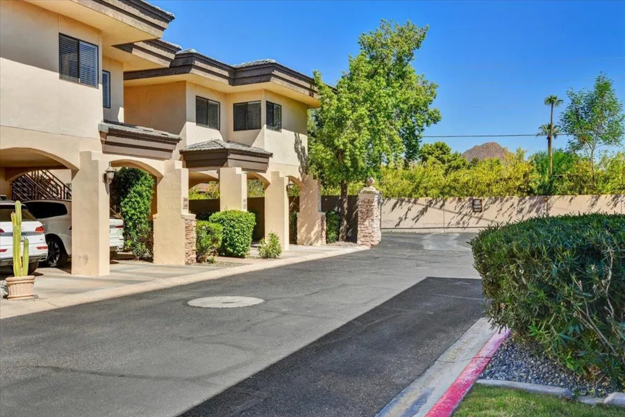 Fantastic Location in Biltmore area at 32nd & Camelback. Gated secure access with great views of Camelback Mountain and Piestewa Peak. This perfectly situated 2 bedroom, 2 bath with laundry room was partially remodeled in 2022. Gorgeous new master bath with all new tile, plumbing fixtures, glass shower enclosure, toilet, vanity and lighting. Master Bedroom and living area have sliding door access to north facing outdoor patio area with additional storage. Bedroom closets updated with barn doors. Upgraded with recessed downlights on dimmers, ceiling fans, new fireplace mantel. New carpeting and paint throughout. A/C system maintained by the HOA. Covered dedicated parking below unit. Vacant and on lockbox