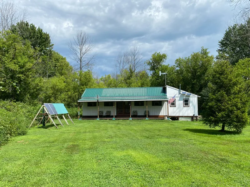 Relax on the deck of this beautiful maintenance-free, insulated and heated cabin... fully furnished and ready to move in. Set on 51 acres of hunting land with four ponds, woods and open fields for food plots - very quiet and peaceful. The fully furnished cabin sleeps five with one bedroom, a dining area with countertop and cabinet storage and an open living area with flat screen TV and ceiling fan. The kitchen contains a large storage pantry, gas refrigerator and gas stove. The utility room includes a commercial steel sink, 100-gallon storage tank, on-demand water pump and hot water heater, 36" shower stall and a composting toilet. The utility room has LP gas heat with a vented forced air heater in the dining room that heats the entire cabin. (All furniture and appliances are included with the sale.) Water is provided from a drilled well and the cabin runs on off-grid solar power with a generator used for backup. The property also has a private septic system. A second generator operates barn lights and power tools. The barn has motion activated, outdoor solar lighting. Also, a covered front porch runs the length of the camp. Located at the west end of the property near the road is a 20 x 30' steel building with poured concrete floors and two, 12' overhead doors at each end. The inside walls are insulated, and the building has two built-in heaters. Included in the sale is a 42hp 4x4 John Deere tractor with all necessary attachments for property maintenance, including a front-loading bucket, in addition to a JD Gator and a 2019 JD riding mower. A 10 x 10' workshop sits next to the steel building. The property is located on a town-maintained, blacktop road and is only five minutes from the NYS Thruway (I-90) - 30 minutes from Syracuse and close to Oneida Lake. Wildlife abounds on the property with several types of ducks, geese, pheasant, deer, turkey, fisher, beaver and others. Overall, this is a great property for outdoorspeople. Financing available.