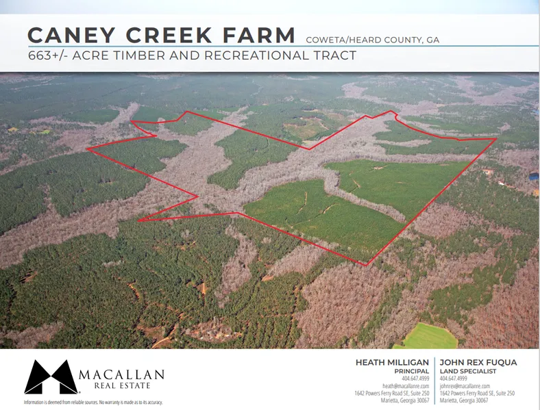 Macallan Real Estate is pleased to present Caney Creek Farm, a meticulously managed timber and recreational tract straddling the Heard/Coweta County line. Well-situated approximately 10 miles southwest of the rapidly expanding city of Newnan and just an hour away from the city of Atlanta, Caney Creek Farm is unique in its off-the-grid feel while also boasting ease of access. With the right management plan, this tract has incredible recreational and investment potential.