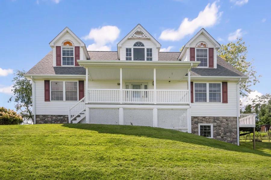 Breathtaking mountain and countryside views surround this spacious Cape Cod just 1.5 miles to Virginia Tech! With 3 bedrooms and 3.5 baths, this home is designed for comfort and function. The main level offers a primary suite with walk-in closet, large kitchen, dining area, living room, laundry, and access to a deck perfect for entertaining. Upstairs, two generously sized bedrooms each feature dual closets and share a full bath. The finished lower level includes a recreation room, theater setup with surround sound, full bath, and additional storage. Enjoy a maintenance-free exterior with a Trex front porch, dual-zoned heat pump, and ample space inside and out. Set on just over an acre, the property showcases mature pear, apple, peach, and plum trees with beautiful yard space for gardening, play, or relaxation. A true blend of convenience, views, and livability close to town yet private e...