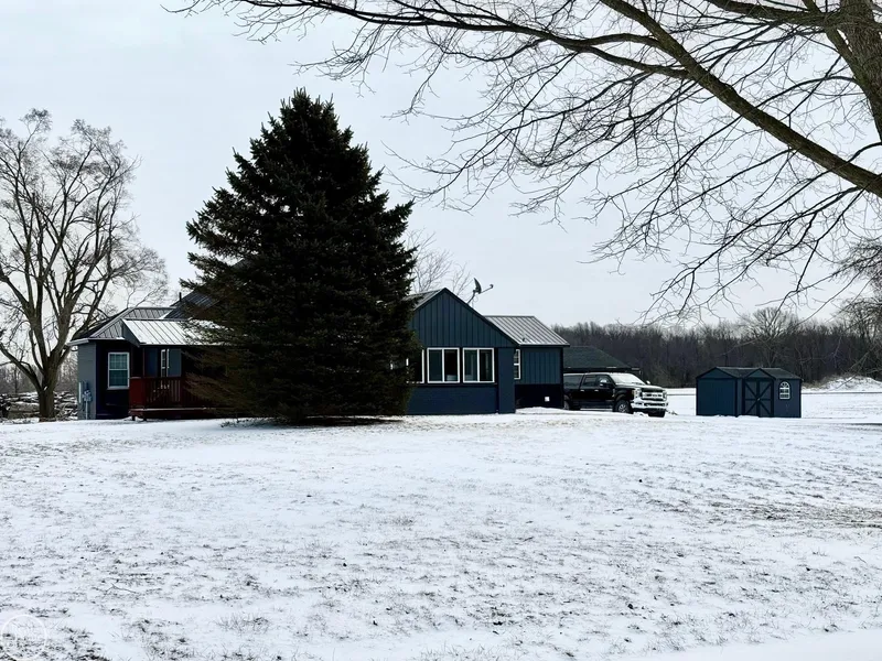 ESTATE SALE!! Rare 5 acre parcel with a 4 bedroom farm house. Exterior of the entire home & garage is all done in metal vertical siding with matching metal roof on both home and garage as well. Great curb appeal with covered front porch w/wooden deck & railings. Rear of home has private matching deck & railing looking out over the 5 acre parcel, vinyl windows, hardwood floors, 2 ceramic baths (1 up and 1 down), open living room w/natural fireplace, maple style kitchen cabinets with peninsula snackbar, 1st floor laundry in side mudroom, 3 season sunroom off the front of the home, 2 bedrooms down and 2 bedrooms up, one large bedroom up has a full bath and large walk-in closet, block basement w/direct access to outside off the rear of the home, copper plumbing, propane forced air furnace, A/C, home needs some TLC, fireplace in the basement, detached 2 car garage that's heated, immediate occupancy, Armada Schools, all appliances to stay.
