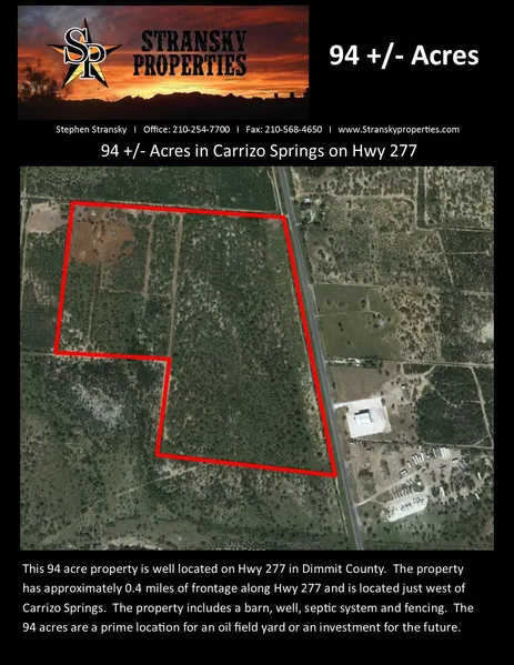 94 acres fronting Hwy. 277 west of Carrizo Springs about 3.7 miles with approx. 1/2 mile of frontage. The property is high-fenced on all three sides except the highway. Improvements include a horse barn, water well & septic system. Wildlife includes white-tail deer, quail, and axis deer.