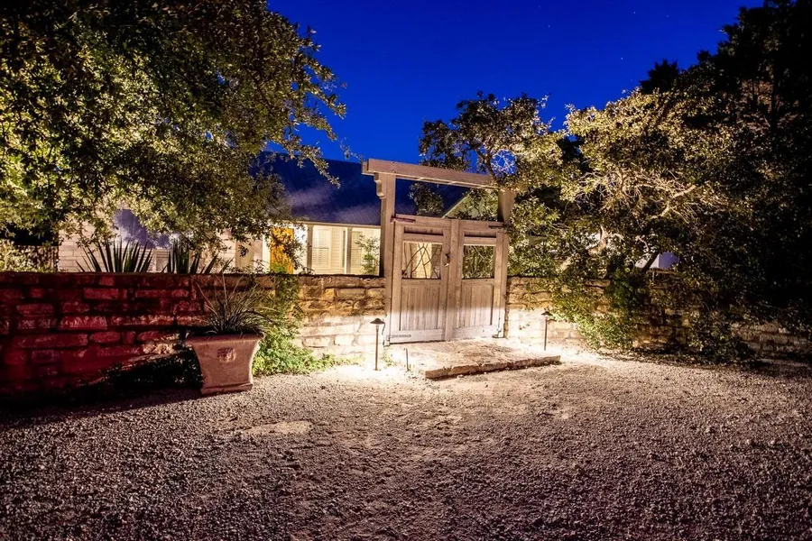 The compound is thoughtfully positioned on the land allowing the vast view of the Bosque River Valley that offers an 80' elevation change. The 3 bedroom, 2 bath main home with hardy plank siding and metal roof has a beautifully appointed courtyard with Santa Fe Style front gates, rock & cedar stave fencing, trellised vines, multiple outdoor fountains, artful pathways, rock walls; stone steps and charming sitting areas surround the home. The property has landscape lighting, an outdoor kitchen area with sink, security cameras and alarm system. E...