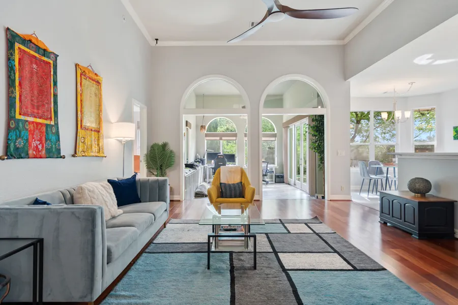 Step inside to discover an open-concept layout featuring high ceilings, crown molding, and recessed lighting. The fully remodeled kitchen is a chef's delight, boasting modern appliances and ample counter space. The primary suite offers a tranquil retreat with a spacious walk-in closet and a luxurious en-suite bathroom. The third bedroom is could be utilized as a home office, providing flexibility to suit your needs.