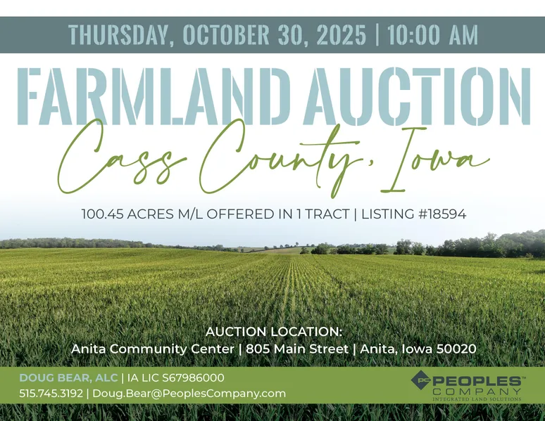 Ideally situated in the south central portion of Cass County, Iowa, this farmland tract would be a smart investment for a beginning farmer, Buyer looking to diversify their portfolio, or anyone interested in a long-term land investment opportunity. The farm will be sold to an existing cover crop lease through February 28th, 2026, and will be offered on a price-per-acre basis at a live public auction on Thursday, October 30th, 2025, at the Anita Community Center at 805 Main Street in Anita, Iowa. The sale can also be viewed through a Virtual Online Auction option, and online bidding will be available.