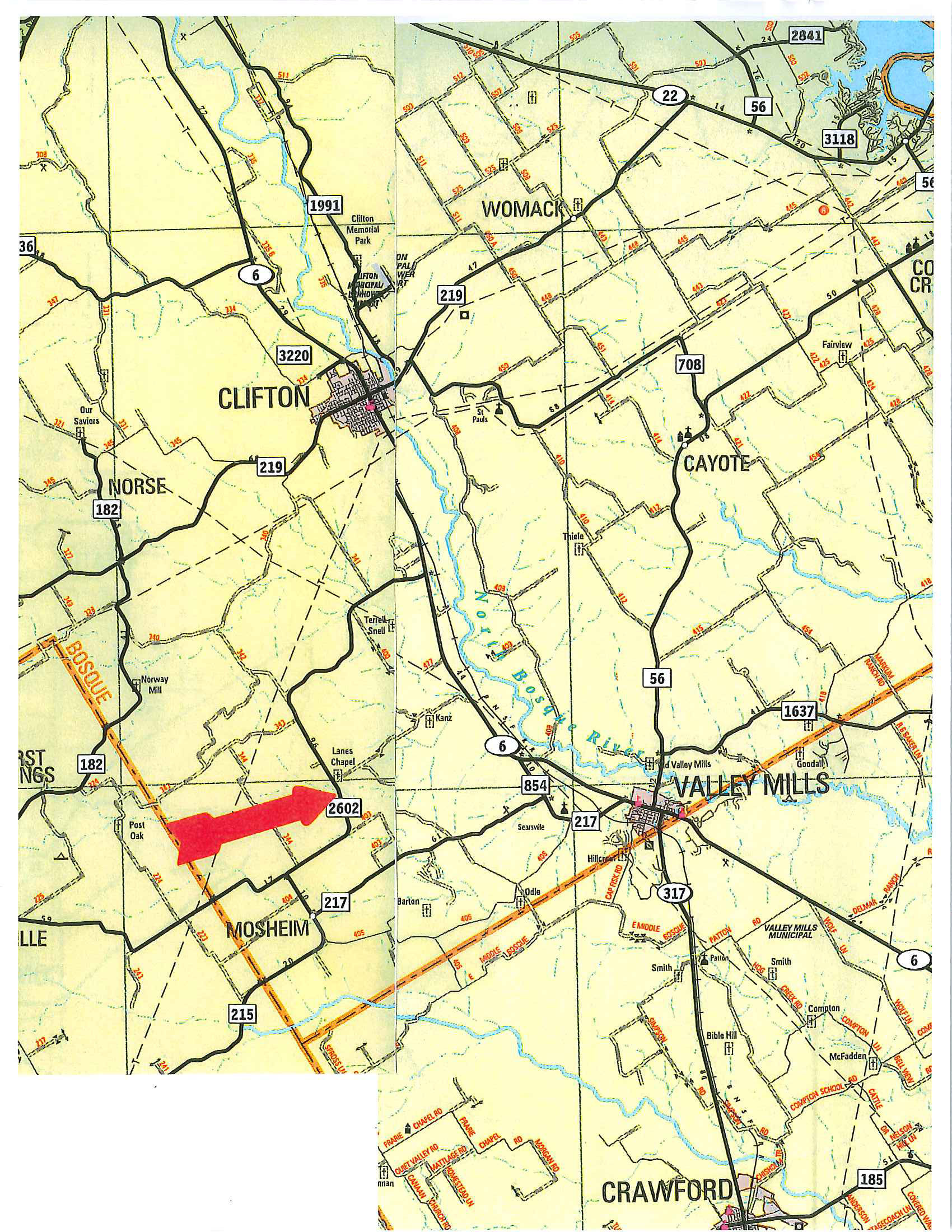 Research Parcel InformationFROM DALLAS TAKE I35 SOUTH TO HILLSBORO. TAKE HWY 22 TO MERIDIAN. GO SOUTH ON HWY 6 THROUGH CLIFTON. RIGHT ON FM 2602 ABOUT 10 MILES ON THE RIGHT.