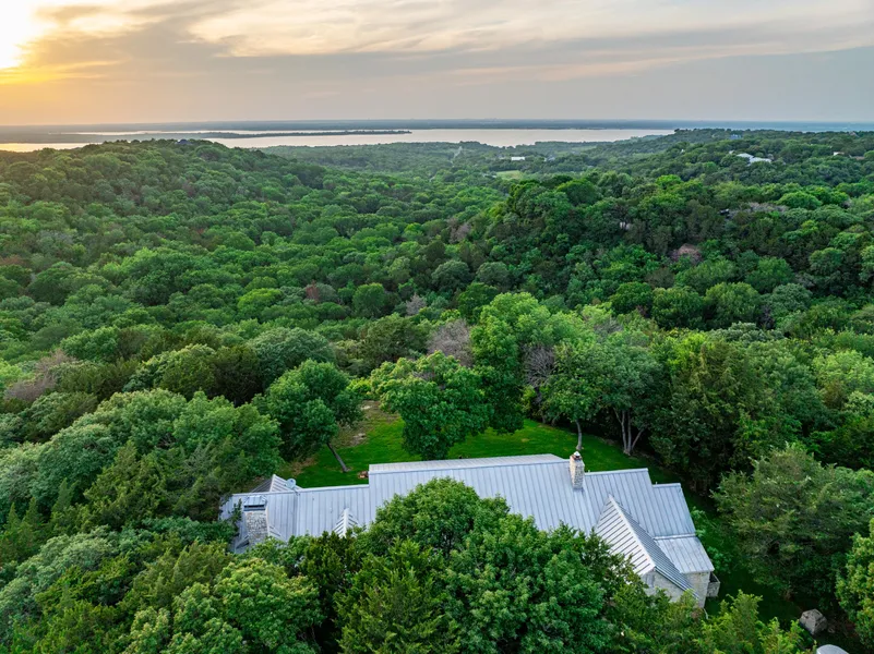 Land: The property totals approximately 124 acres and is a mixture of gently sloping open pasture with native grasses and scattered trees in the southeastern and southwestern quadrants. The balance of the property is heavily treed with a ravine running north to south through the middle of the tract with steep slopes and elevation changes of up to 150 feet, from a low of 700 feet in the low portion of the ravine to a high point of 850 feet. As mentioned, there are spectacular views west of Joe Pool Lake and beyond from the house and other locations on the ridgeline.
