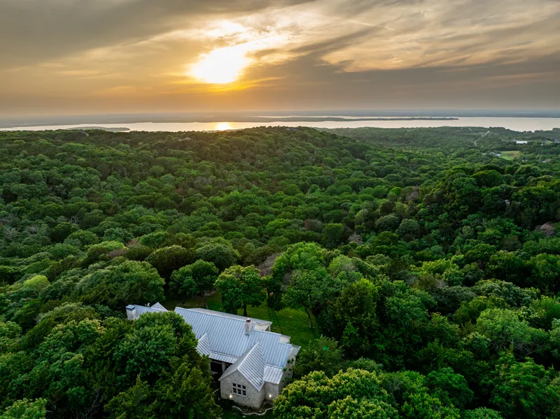 Land: The property totals approximately 124 acres and is a mixture of gently sloping open pasture with native grasses and scattered trees in the southeastern and southwestern quadrants. The balance of the property is heavily treed with a ravine running north to south through the middle of the tract with steep slopes and elevation changes of up to 150 feet, from a low of 700 feet in the low portion of the ravine to a high point of 850 feet. As mentioned, there are spectacular views west of Joe Pool Lake and beyond from the house and other locations on the ridgeline.