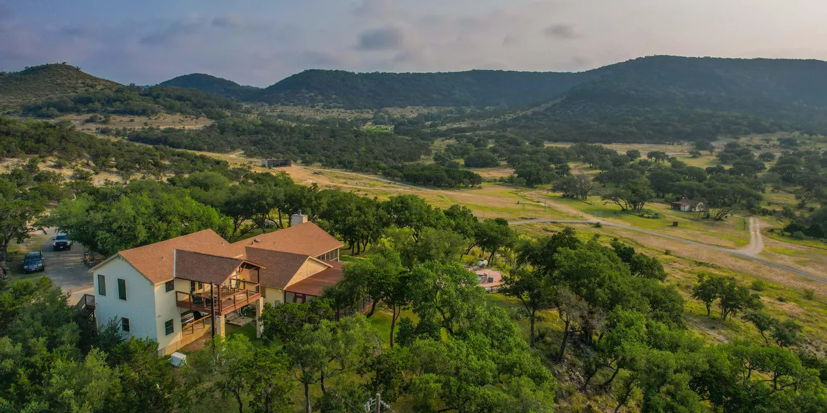 The custom-built main home sits on a high point, capturing panoramic views across the ranch and overlooking a resort-style pool with a waterfall feature, extensive patio space, a screened-in porch, and a fire pit. Inside the 1,916 sq ft home, you'll find 3 bedrooms, 2 bathrooms, a recently remodeled kitchen with granite countertops, vaulted ceilings, and a large stone fireplace. A wraparound porch enhances the hilltop setting, and an enclosed animal habitat is attached to protect small pets from predators. A recently installed 24kW Generac backup generator serves both the main home and the luxury apartment, providing added peace of mind.