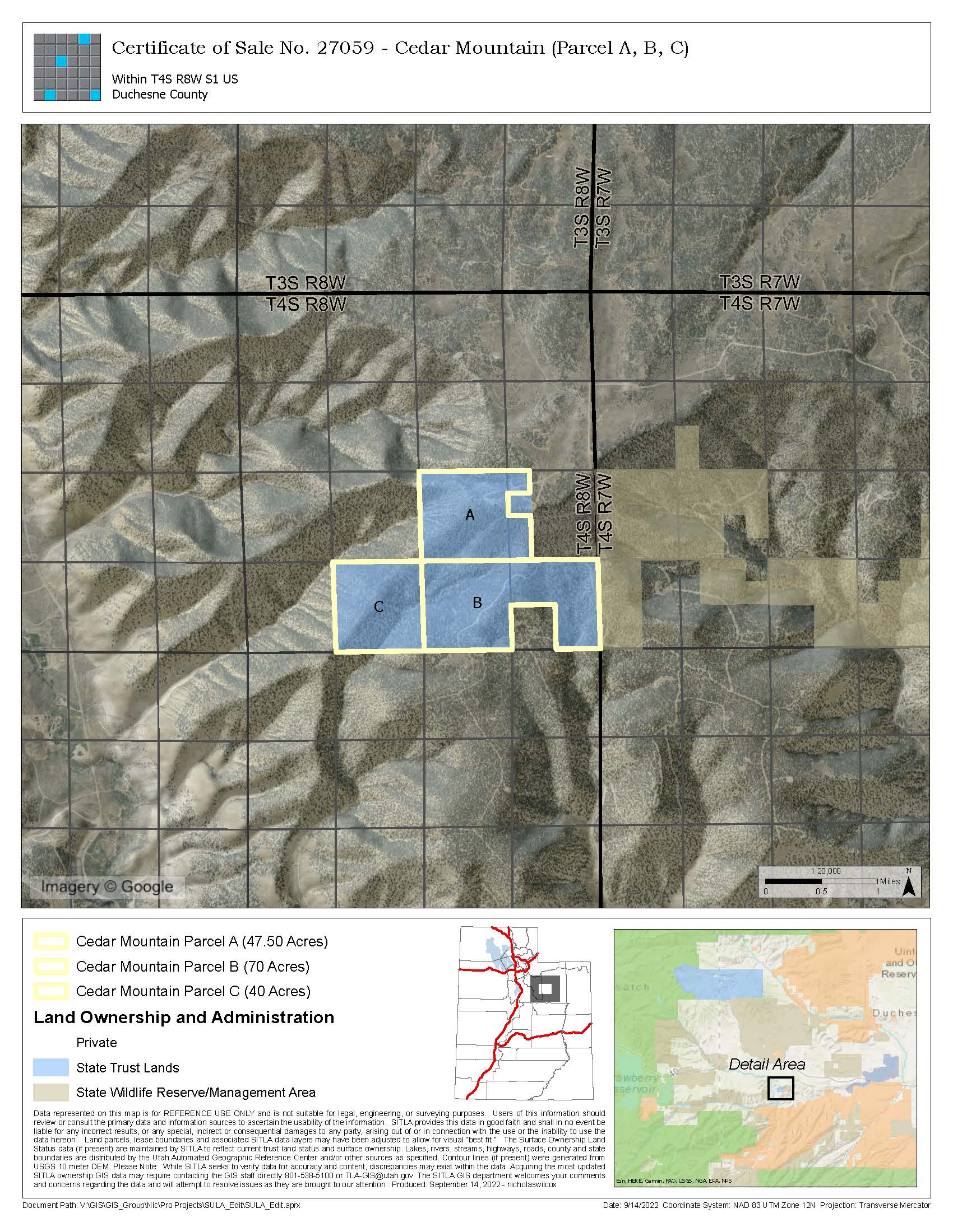 LAND FOR SALE AT PUBLIC AUCTION: Utah School and Institutional Trust Lands Administration is selling 3 adjoining parcels in Duchesne County, Utah at a public online auction to be held November 9-15, 2022. Parcel A has 47.50 acres and has a minimum price set at $38,750. Parcel B is 70 acres and has a minimum price set at $54,250.00. Parcel C is 50 acres and has a minimum price set at $31,000. The terrain of the parcels ranges from flat to very steep. The vegetation is cedar trees, junipers, sage, and native grasses. All properties have good access from dirt roads, with the exception of Parcel C. There will be an easement reserved through Parcel B to give access to Parcel C. Year-round access may not be possible due to the nature of the topography. This is a beautiful area with amazing views from the higher elevations. Financing is available.