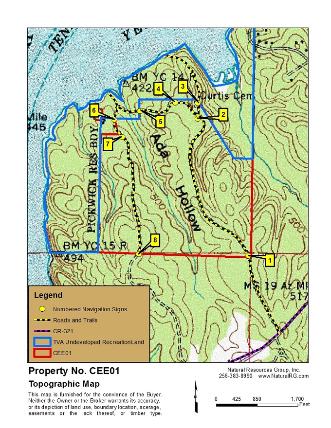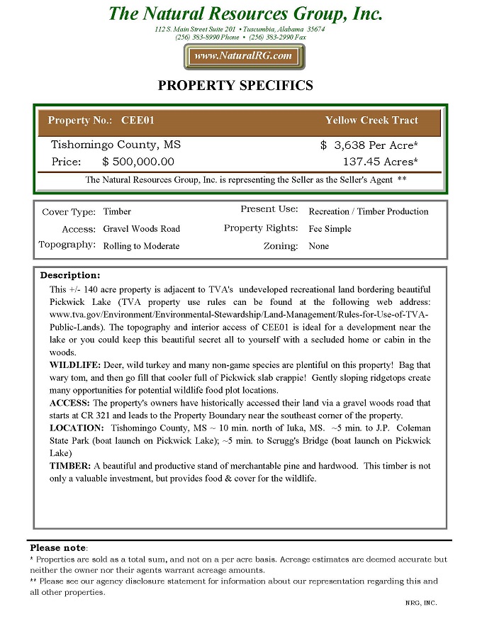 This +/- 140 acre property is adjacent to TVA's undeveloped recreational land bordering beautiful Pickwick Lake (TVA property use rules can be found at the following web address: tva.gov/Environment/Environmental-Stewardship/Land-Management/Rules-for-Use-of-TVA-Public-Lands). The topography and interior access of CEE01 is ideal for a development near the lake or you could keep this beautiful secret all to yourself with a secluded home or cabin in the woods.