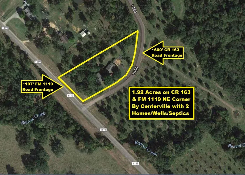 Great Price & Rental Income Potential! 1.92-Acre Corner Lot located on NE Corner of FM 1119 & CR 163 By Centerville. Lot has 197 ft FM 1119 Road Frontage, 600 ft CR 163 Road Frontage, 1857 sqft 3/2 Main House w/1-Car Carport & 12x24 Shed, 1352 sqft 2/2 Guest Home w/Office & 1-Car Attached Garage, Water Well, 2 Septic Systems, 75-Gallon Propane Tank & Gorgeous View of 46-Acre Pecan Orchard. Part of 48 Acres that has been divided into 2 lots by CR 163. Price is for Lot 1 which is 1.92 acres w/2 Homes. Lot 2 located on SE Corner of FM 1119 & CR 163 is Also Available For Sale either combined or separately, which has 46.08-Acre Award-Winning Pecan Orchard with ~260 Choctaw, Cheyenne, Mohawk, Mahan & Podsednik Pecan Trees, 1240 Sqft Metal Barn; Creeks, Bridges & Abundant Wildlife Perfect for Hunting. Excellent Location only 3 Miles to I-45 with Easy Commute to Houston & Dallas. 60 Miles to Huntsville & College Station Easterwood Airport. Pictures & Drone Video are of Both Lots!