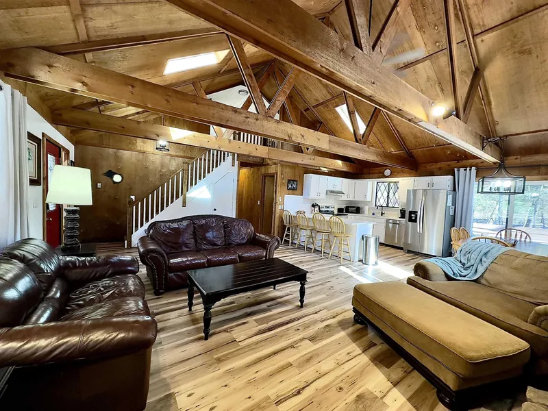 This brookside chalet is just what you are looking for. Timberline Mountain ski slopes are just steps away, yet this home is easy to drive to and has plenty of parking. No scary 'north-facing' roads to fear here. The owners lovingly named this home due to the babbling brook that flows in the beautiful back yard, perfect for all season enjoyment. Listen to the brook or watch the deer frolic from the private hot tub and covered deck area. With a half-acre lot, you have plenty of level space for outdoor games or get togethers. After a full day of outdoor activities, come inside and enjoy the many updates. Updated flooring throughout home, new kitchen with upgraded appliances, and two beautifully updated bathrooms. Two bedrooms with en-suites on the main level and a loft and additional bedroom upstairs provides plenty of space to spread out.