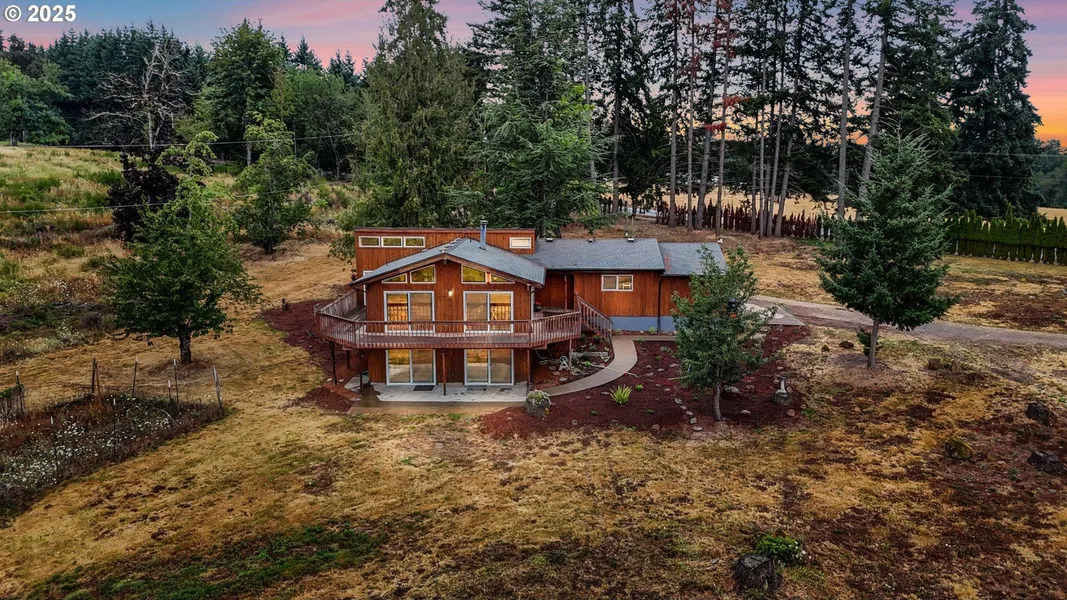 Discover the perfect blend of rustic charm and modern convenience in this exquisite chalet-style home, ideally located just minutes from downtown Molalla. Nestled on a sprawling an almost 20-acres, this property offers the most breathtaking views of Mount Hood right from your living room as well as daily deer and wildlife. Experience the warmth of exquisite wood craftsmanship and large windows throughout the home. Enjoy cooking in the modern kitchen, equipped with Stainless Steel appliances and stylish finishes. Retreat to your primary suite featuring a walk-in custom shower with rainfall multi-head shower, enjoy your favorite movie from the soaking tub- providing a spa-like experience at home. The versatile lower level offers options as media room or potential dual living opportunity, perfect for guests or as a separate living space. The massive 2800 sqft shop awaits your creativity- built on an 8-inch slab, with 400-amp power across two electrical panels, and two 2500-gallon water holding tanks, offering endless possibilities for projects or storage. Additionally, for those with adventure in mind, easily accommodate your RV with a convenient water and power hook-ups. and large RV site at the top of the property. Established Apple & Plum trees and dedicated garden space to bring this little homestead to life. Enjoy the serenity of rural living while being just a stone's throw away from town. This property strikes the perfect balance between seclusion and accessibility.