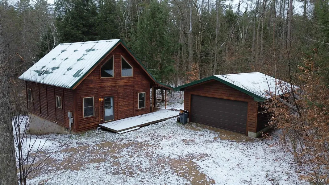 Experience true Upper Michigan living in this Western Red Cedar log home, set on 2 acres that border U. S. Forest Service land. Located in the heart of the Hiawatha National Forest, this property offers direct access to endless outdoor recreation. The home features two main-level bedrooms plus a loft that works perfectly as a third bedroom. Enjoy the warmth of vaulted ceilings, a covered front porch, and a walk-out basement that adds flexibility and storage. A detached 2-car garage provides plenty of room for vehicles and gear. The metal roof offers durability and low maintenance for years to come. Situated across the road from Powell Lake, this property is ideal for anyone who loves the woods, water, and privacy. Built in 2005 and well cared for, furnishings are also negotiable. The setting is hard to beat—quiet, scenic, and surrounded by the beauty of the Hiawatha National Forest!