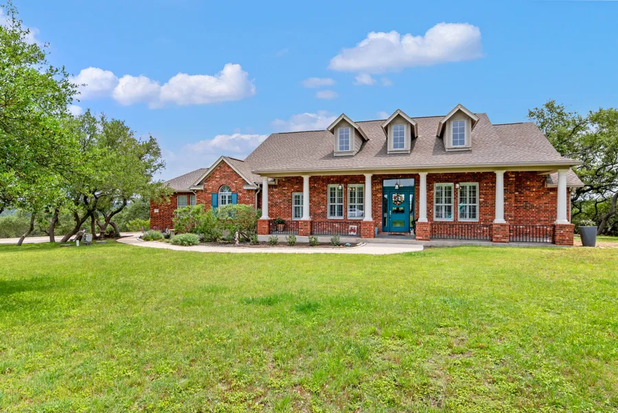 Drive down the private cul-de-sac and enter through the automatic swing gate. Leading you up the tree-lined concrete driveway to the main house. Canopied by mature Texas Oaks, Red Oaks, Junipers, and enjoy Axis deer, turkey, raccoons, fox, and even the elusive Black Buck antelope. Mountain Laurels surround this home that is perfectly situated on a 4.413-acre lot with expansive views. This high-ceiling front porch welcomes guests with multiple seating areas running the length of the red brick traditional-style home. Plenty of natural light, a low-profile picture window, and vast views of the Texas Hill Country greet you upon entry. This single-level 3-bedroom, 2.5 bath home plus Study/Office was remodeled to the cheerful, bright, inviting space that it is today. The open floor plan provides a large living space encompassed by the double island kitchen, dining, and family room. The second island has a sink, a wine refrigerator, and an ice maker. Both islands offer additional seating. Incredible WOW views. The kitchen boasts teal granite countertops, custom cabinets, and high-end appliances. The primary suite offering tree-top elevation views. Step into the charming ensuite bath to enjoy a separate shower and bathtub. Step out onto the Trek Deck covered patio area that wraps the rear of the house, and additional square footage of open-air deck on both sides. The lower property provides possible space for an additional dwelling, a swimming pool, and space for horses. Situated in the front fenced yard areas are a water well house, a large water storage tank, a pet pen and a shed. Separate gated garden, included kids' playscape for new owners, and a flagstone fire pit patio - just right for s'mores. There is a secondary gated parking drive for RV/boat storage or extra vehicles. Additional parking is ideal for gatherings. Generac Whole House Generator. No city taxes. The nature preserve-like Clear Springs Park neighborhood is the best of city/country life. Hwy 281 North - The Guadalupe River and Canyon Lake are water options nearby. Drive down Hwy 281 South - The San Antonio International Airport is 15 miles away. Enjoy the Farmers Market at the iconic Pearl on Saturday and Sunday, just 21 miles from your front door. The historic Alamo and the downtown River Walk are only 23 miles away.