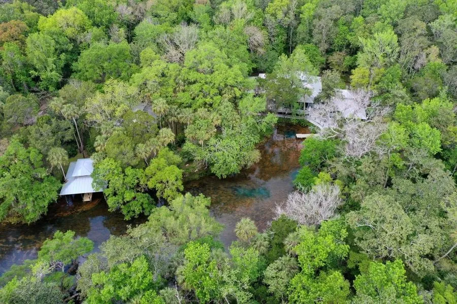 The property contains multiple spring vents of Crab Creek Springs and additional smaller springs. These springs remain a refreshing seventy-two degrees which makes swimming or diving inviting. Another impressive feature of the property is a long boardwalk meandering along the propertys waterfront and in between the many different cabins and buildings.
