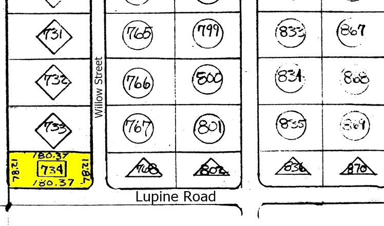 Lupine Road comes to Lot 734 from the east. It intersects with Willow Street on the east side of the property, making 734 a corner lot.