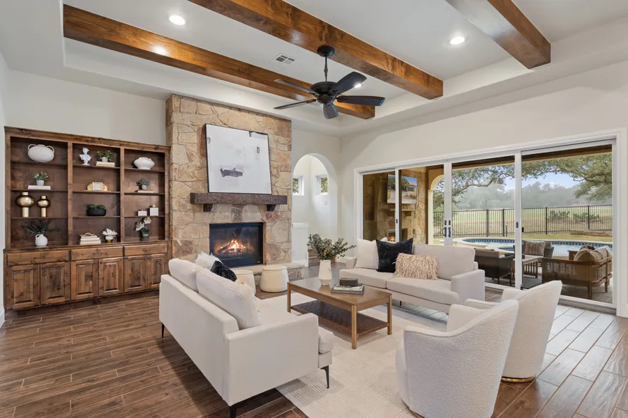 Golf course home with pool in private Cimarron Hills Country Club community. Custom built by Goodner Brothers, this home is on a heavily treed lot and backs to the 6th hole of the Jack Nicklaus signature golf course. Wide open interior design that features living, dining, bar, and kitchen areas all connecting for easy entertaining and flow. The gourmet kitchen has a full suite of Thermador appliances that includes a built-in oven, warming drawer, built-in stainless refrigerator, and free standing oven with 6 burner gas cooktop. The primary bedroom suite privately located on the back corner of the house has views of the pool and golf course, spacious closet with built-ins, and dual showers and vanities. Multiple work from home spaces exist on both levels of the home: a built-in desk off the kitchen, built-in desk in the first floor guest room (also includes a Murphy bed), and a cool office nook in the second floor living area that has views of thick trees and golf course. The spacious second floor living area is a perfect spot for watching sports or movies with custom wet bar and wine fridge and the balcony that overlooks the pool and golf course. Solar panels and Tesla battery/energy storage offer low utility bills, a tax exemption, and stored energy during power outages. A true three car garage (not tandem) and circular drive for easy parking and vehicle storage. Luxury lifestyle in this gated/country club community with Jack Nicklaus Signature golf, fitness facility, spa, tennis and pickleball. Cimarron Hills is located in the charming, historical town of Georgetown, Texas.