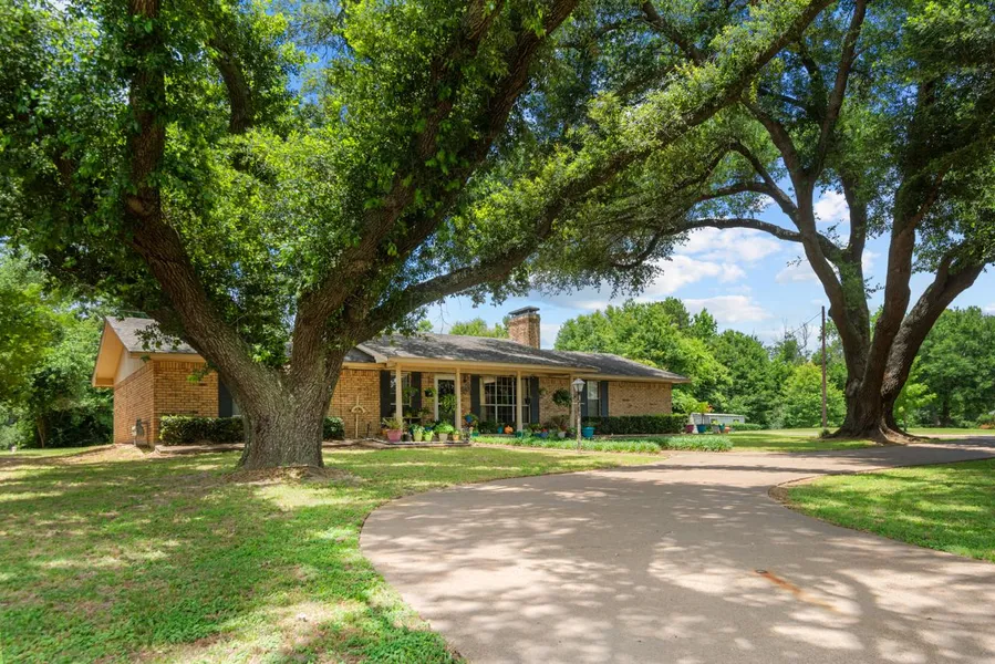 This three bedroom, two bath brick home has so much to offer. This home is located just a mile off Loop 304, in a very desirable area. The home sits on a hill with a great view of the neighboring lake. Youll be impressed with the lovingly maintained home in excellent condition. The open living has a fireplace, beamed ceiling, tray lighting, and attractive laminate flooring. The nice-sized open dining area with galley kitchen has updated appliances. The primary bedroom has a private bath, while two guest rooms share a hall bath. This home has good closet space throughout. There is an attached two-car garage and a detached garage/shop. The backyard has a covered patio to sit back and relax in the evenings. Give us a call today to schedule a private tour of this country home with a beautiful setting!