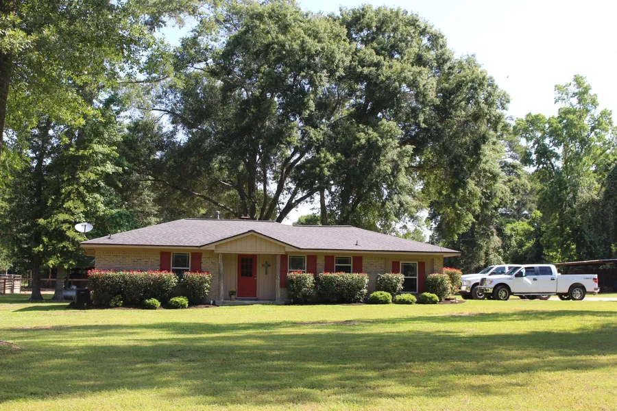 Delightful small ranch in the booming I-45 corridor! 9.99 varied acres, one-story ranch home, barn, arena, pastures under hardwoods. 1452 SF home with wood-burning fireplace, 3 bed, 2 bath, and an office set in a large, well-maintained yard. 5-stall barn, round pen, and 200x200 arena. Rear of property is like a park - green grass under large hardwoods. Fully fenced, cross-fenced. Unrestricted, a quarter of a mile west of I-45. Pretty & comfortable now, lots of potential in future.