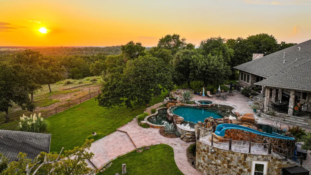 Improvements: In addition to its expansive acreage and natural beauty, the property boasts a custom-built 4,695+/- sq ft main residence, thoughtfully designed with quality craftsmanship and spacious living areas. Some of the finer finishes include Brazilian slate and custom cabinetry. A separate 1,200+- sq ft guest house offers comfortable accommodations for extended family or guests. At the heart of the outdoor space is a stunning custom infinity-edge pool, complete with a built-in waterslide, creating a true backyard oasis perfect for warm Texas days and gatherings with friends and family. The property is well-equipped for both recreational and functional use, featuring two large barns that provide ample storage for equipment, vehicles, tools, and hobbies. A dedicated greenhouse allows for year-round gardening, adding to the propertys versatility and self-sufficiency. Located at the end of a quiet cul-de-sac, this ranch offers blacktop road access and an automatic gated entrance, ensuring both security and privacy.