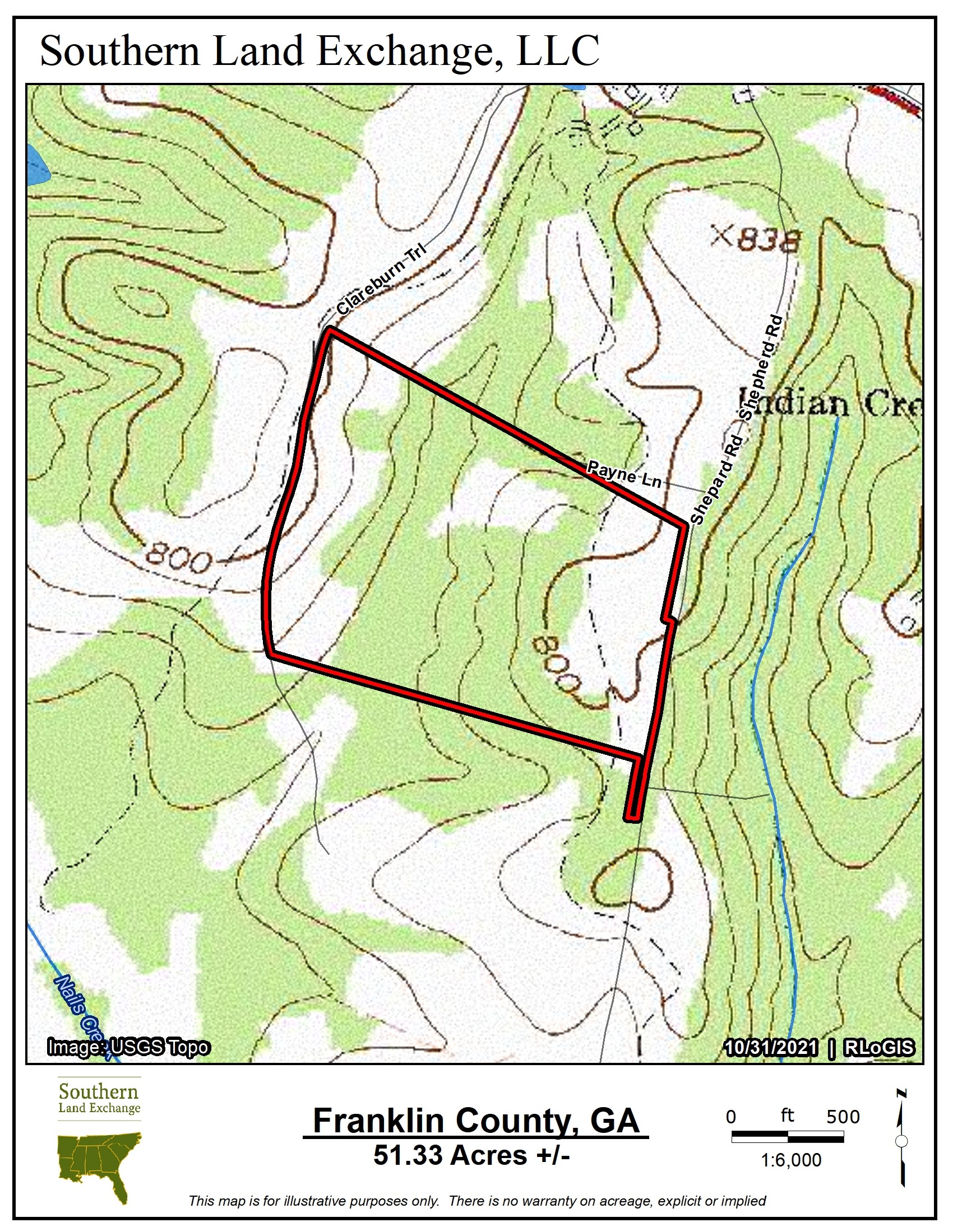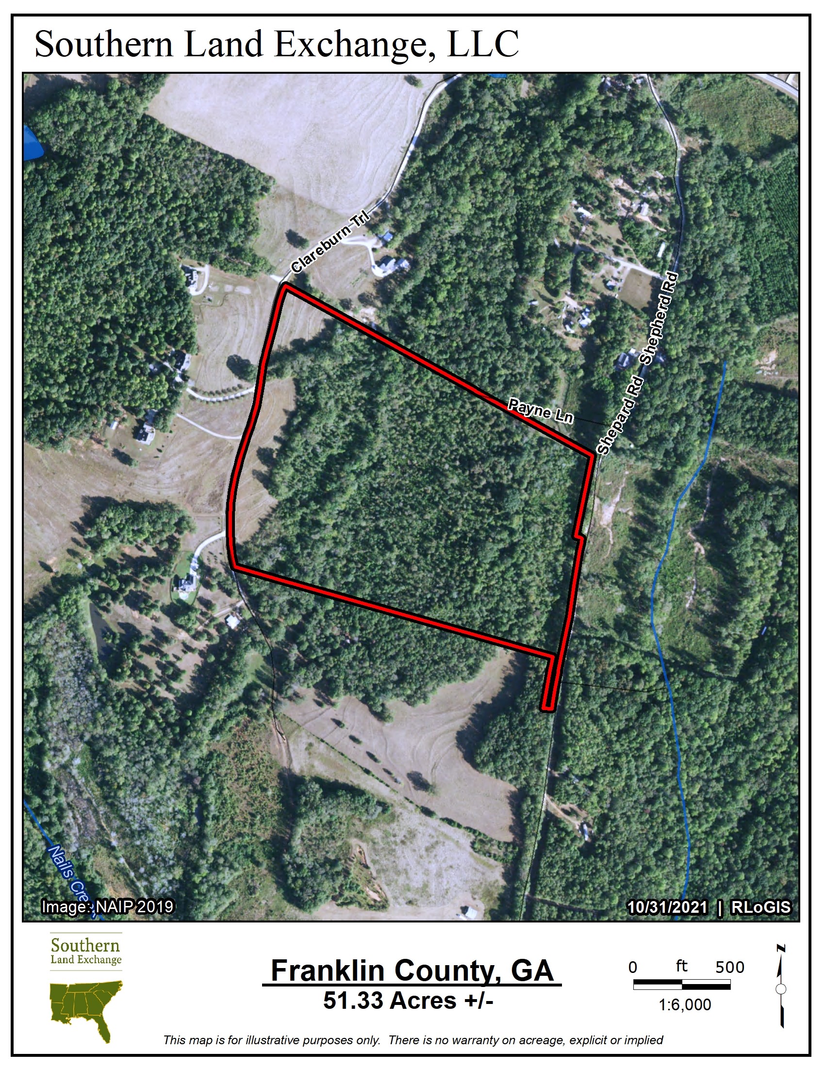 Southern Land Exchange is proud to present another remarkable offering in Franklin County. Here is a 51-acre tract with split pasture and woods. Unlike most properties in Franklin County that are very pasture oriented, this tract offers buyers more woods than pasture. That means more privacy, more recreational use, and more hunting opportunities! Just enough pasture is available for those needing acreage for some livestock, or for someone looking for the perfect dove field. Did I mention the location and road frontage?! This properties sits only half a mile from HWY 51, 2 miles from I-85, and 7 miles from Carnesville. Also offering ample double road frontage with 1,500ft of road frontage on Clareburn Trail and 1,300ft of road frontage on Shephard Road. It's the perfect location to build your dream home, secluded and off the road. Enjoy hunting your own property. Plenty of pasture for a small farm. Clear timber and convert to pasture as your needs grow over time. Take comfort in knowing that Clareburn Trail is a quiet private road with only 12 other properties, mostly larger tracts and family estates. Call Travis Ebbert w/ Southern Land Exchange for more information at 706-614-8840.