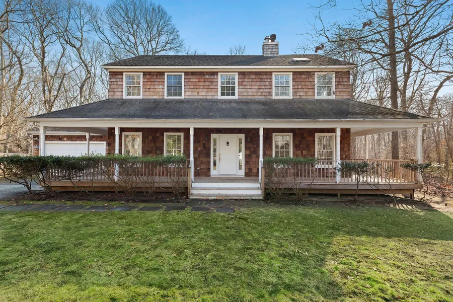 Situated between East Hampton Village and Amagansett, this classic, shingled Hamptons home with a captivating wrapround porch offers the perfect setting for entertaining and relaxing. With 9-foot ceilings throughout the first floor, the heart of this home is a sun-drenched room with expansive windows and sliding doors, seamlessly combining the eat-in kitchen and living room and creating an inviting atmosphere for everyday living. And, there is a separate dining area for more formal occasions. The den, which shares a dual-sided fireplace with the living room, is ideal for remote work or watching TV. The powder room also serves as an easily accessible pool bathroom. A first-floor dedicated laundry area simplifies household chores. On the second level, a generous primary bedroom with large closets includes a spacious en-suite bathroom with dual sinks, soaking tub and shower. Three additional bedrooms share a hallway bath with double-sinks and bathtub, with one of those bedrooms having its own separate access to the bath. The unfinished lower level provides an opportunity to add future value by creating new living space; it is enhanced by a second staircase leading directly to the attached two-car garage. Outside, the serene, covered porch overlooks the heated vinyl pool, outdoor shower, and beautifully landscaped grounds. The wooded preserved lands on the property's western and southern boundaries add to the privacy and tranquility of the rear yard. When venturing away from the property, nearby world-class restaurants and famous ocean beaches are just minutes away.