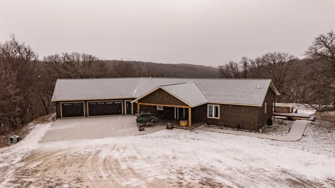 an inviting open floor plan that effortlessly connects the living, dining, and kitchen areas, making it perfect for entertaining or family gatherings. Large windows allow plenty of natural light to flood the space, creating a warm and welcoming atmosphere throughout. The main level features a luxurious master suite, complete with a huge walk-in closet and a spa-like en-suite bathroom, offering dual vanities, and a walk-in shower. There are two additional well-sized bedrooms( one nonconforming) each with ample closet space. Downstairs, the fully finished basement provides even more living space, ideal for a home theater, game room, or additional guest quarters. The oversized, heated garage is a true standout. With ample room for vehicles, tools, or additional storage, it offers a perfect space for hobbies, outdoor gear, or even a home workshop.Outside, the property truly shines. A large deck spans the back of the home, perfect for grilling and relaxing. Set on +/- 25 acres of rolling terrain the property offer endless possibilities for the rural life style! There is an additional 2BR/1BA home situated on the farm that could be used as a mother in law suite our guest house. Two grain bins and additional 32x178 steel buildings are included with the sale. Whether you're looking to enjoy the space, create your dream homestead, or simply relax in a tranquil setting, this property is ready to welcome you. Dont miss your chance to own this exceptional home and expansive acreageschedule your private showing today!