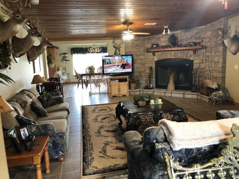 This has been a well managed trophy whitetail hunting property for many years, 10 pt or better. Also, loaded with turkey and other small game. Watch deer and turkey from the deck of your 4 BR 2 Bth cabin overlooking big open fields. Shooting houses are located on each foodplot and ladder stands and tripods are located strategically throughout the property in hardwood bottoms and draws for some great bow hunting. Clear Creek flows through the north half of the property for a great water source for wildlife. There are a few bluffs and caves around the creek that has produced many arrowheads as well. A large pond is also located on the north half of the property. The south half of the property features some large foodplots and ladder stands. Hunt the greenfields or the hardwood bottoms here as well. Property also has a tractor shed and storage for your implements. Cabin is over 2400 sq ft a...