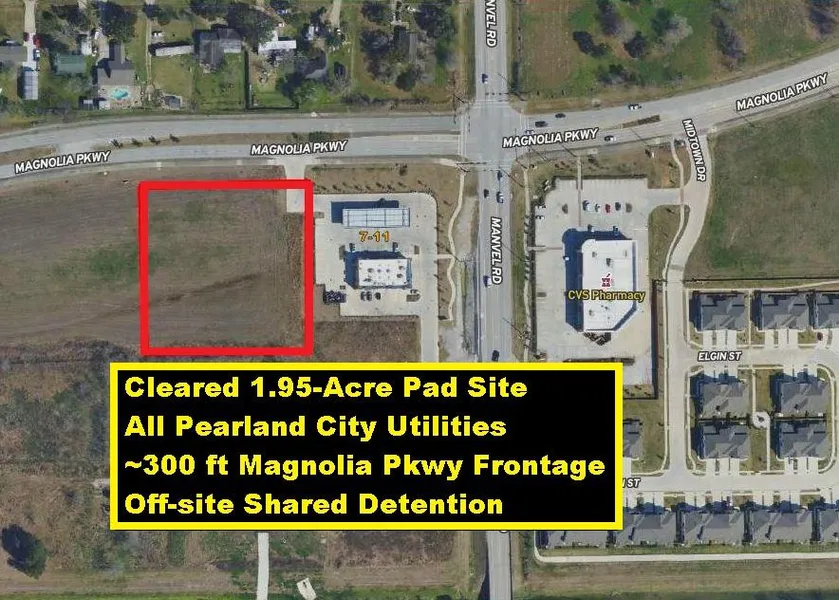 Cleared 1.95-acre pad site visible from FM 1128/Manvel Rd with ~300 feet of road frontage on Magnolia Pkwy. All Pearland City Utilities and off-site shared detention are available. The site is located next to the 7-11 on the SW Corner of Magnolia Pkwy & FM 1128 traffic light. Shared access driveway is in place. The site is part of an approved Planned Development anchored by a to-be-built 360-unit Class A multifamily project. The 2023 Projected population within a 3-mile radius is 84,483. The lot lies 3.5 miles East of Hwy 288, 3.3 miles West of Hwy 35, 6 miles North of Hwy 6, 1 mile South of FM 518, 15 miles South of the Texas Medical Center & 18 miles South of Downtown Houston. Magnolia Pkwy is a 4-lane Blvd connecting Hwy 288 to Pearland Pkwy as an alternative to congested FM 518. Just South of the pad site is Pearland's new Massey Oaks Ranch Master-Planned Community bringing ~950 new homes to the area. Massey Oaks Elementary, Miller Jr High & Rogers Middle School are all nearby. A 1.35-acre pad site on FM 1128/Manvel Road is also available for sale separately. See the Site Plan.