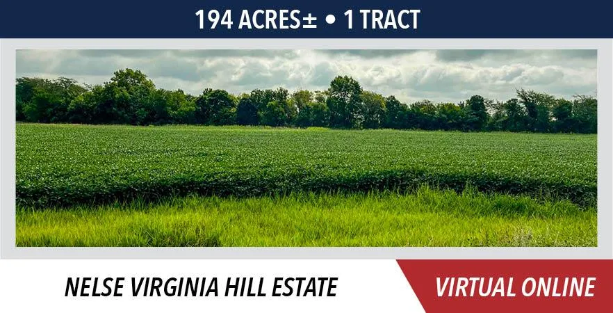The Nelse Virginia Hill farm is located approximately 4 miles southwest of Westfield, IL or 13 miles southeast of Charleston, IL. The property is further described as being located in Section 7, T11N-R11E, Hutton Township, Coles County, IL and Section 7, T11N-R14W, Parker Township, Clark County, IL. The farm contains a total of 194 Acres (subject to survey), will be sold in 1 tract and represents productive tillable cropland.