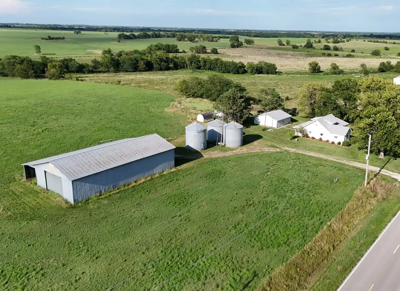 Great Farmstead on 40ac+/-, paved road across front, gravel road across back. 4 bedroom, 2 full bath house with carpet throughout and partial concrete basement. 80 x 40 Barn with partial concrete floor and an 80 x 16 lean to open on the ends. Also there is a separate 10 x 20 feed shed/tack room building and a 900 sq.ft. detached Garage with one deep car space and a 15 x 25 finished office area that could be used for a man-cave or Family room, use your imagination! The house & detached garage have new roofs. The home has AC / Heat pump which operates with electricity until 35* and below when propane heating takes over. One upstairs bedroom has window AC. Laundry closet on 1st floor. The Living room was an add on to the house in 1960. The upstairs bedrooms were finished in 1970. The kitchen and bathrooms were remodeled in 1990. There is so much to see in this house! The house is on Rural Water and there is a hydrant by the catch pen. The property is fenced on the West and East sides. The NE corner of the property has a wooded, seasonal stream providing a great hideout for deer. The open acreage has been hayed for many years, producing 64 big round bales in 2024. The hay meadow has an Incredible View from the high point on the hill in the middle of the property. A portion of the land was farmed in the past. The farmstead also includes three grain bins which have been rented to local farmers and a 4th small grain bin just the right size to repurpose into a Country Gazebo. Near the feedroom/tackroom is a catch pen for your horse or cattle. This is an incredible property that many people are looking for; 40ac+/- of good grass, a wonderful home over 1,860 sq.ft., multiple bedrooms and bathrooms, paved road, rural water, good cell phone service and high speed internet available!