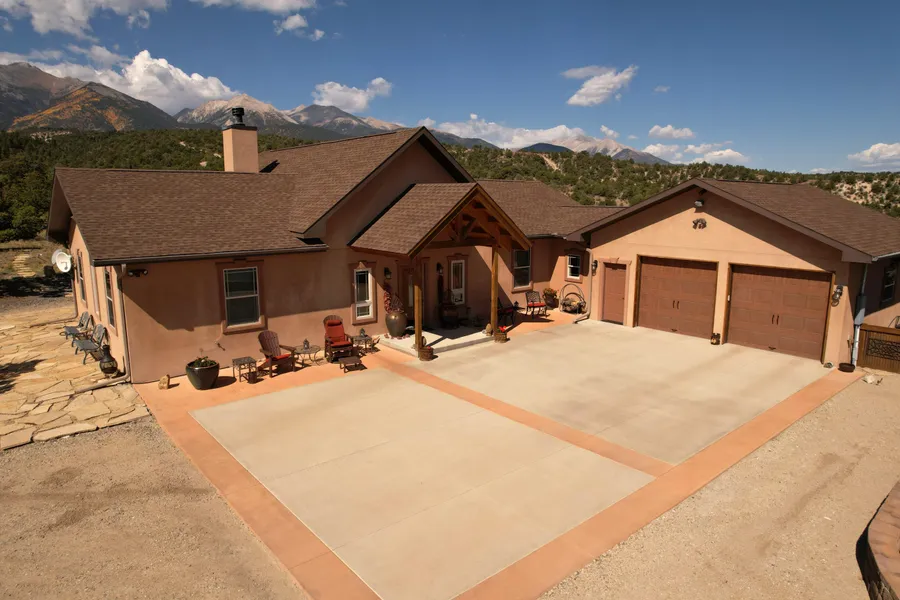 Custom Colorado mountain home on 35.64 acres in the heart of the Collegiate Peaks range. 2,805 square feet, 3 full bathrooms, 3 bedrooms plus a large bonus room currently furnished as a replica 1800's saloon. The open floor plan with a high vaulted ceiling and large windows provides lots of natural light and incredible mountain and valley views in all directions. Hot water in-floor heat and a large wood burning stove provide comfort and efficiency. High-end finishes and trim work throughout. Home is on grid power with a backup generator and the original solar panels and solar system are in place if you wish to connect them for additional backup power or savings. Outside living space is enormous and inviting with multiple connected terraces offering sitting areas in the sunshine or in the shade of the mature trees. The pictures don't do justice to the views from this ridge top building si...