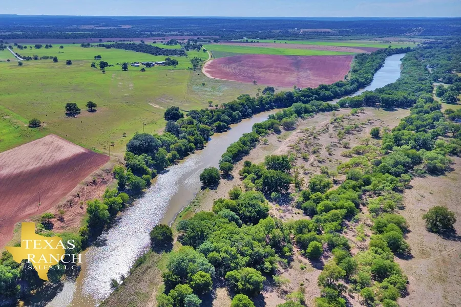 The low-fenced property enjoys a beautifully varied landscape. The land has a ratio of 65% brush to 35% pasture and ranges from good grazing pastures with sandy loam soil to rich riverbanks lined with trees. Flat to gently rolling terrain with native grasses and massive pecan and oak trees cover the lower half of the property. Towards the back half of the property, there is an approximate 200-foot rise in elevation, revealing a horseshoe-shaped hilltop with 20-mile views of the vast surrounding countryside, perfect for building your dream home.