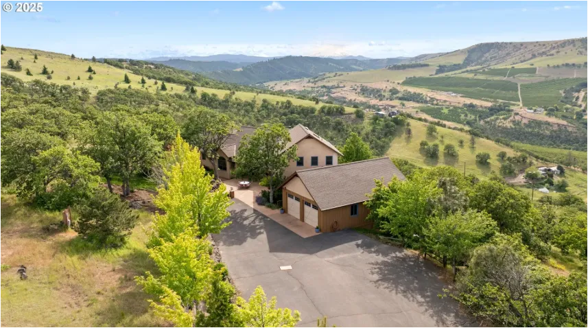 Set on 9 private acres, this custom Columbia Gorge estate brings together modern Northwest design and jaw-dropping viewsMt. Hood, Mt. Adams, the Columbia River, and rolling orchards all laid out like a living landscape painting. The home itself? Warm, intentional, and full of light. A gourmet kitchen made for slow mornings and dinner parties alike, a main-level primary suite with floor-to-ceiling views, and rich natural finishes throughout that nod to the beauty outside. Every detail feels thoughtful, from the handcrafted woodwork to the generous windows that let the landscape do the talking. Theres space for everyone herewith detached guest quarters for visitors or your next creative project, an oversized two-car garage, and a separate shop for gear, tools, or whatever big ideas youre cooking up next. Whether youre after a quiet retreat or a basecamp for all your Gorge adventures, 5331 ...