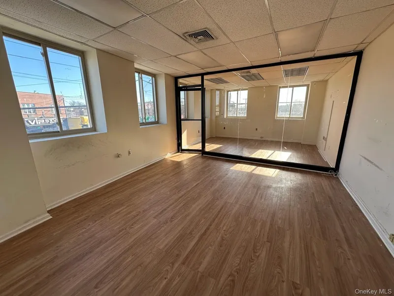 Bright Commercial Office Space Available Well-lit commercial office featuring wood-style flooring, large windows with natural light, and a modern glass partition ideal for a private office or meeting room. Neutral finishes throughout with a functional layout suitable for professional, creative, or administrative use. Convenient and move-in ready.