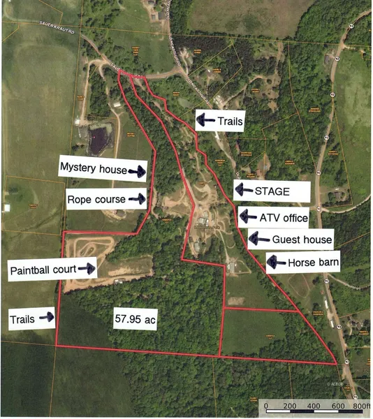57.95 ac. in Hocking Hills that has unlimited potential. Seller has built attractions already in place. You can keep the ones you want. They include 2 commercial bathrooms, a 3-bedroom 2 bath home, parking for 300 plus cars, a 40x40 commercial stage for concerts & entertainment, Horse barn with 10 stalls electric & water, a rope course , Mystery House (Super Cool) Vertigo Tunnel, 40x30 Shalet with seating on back deck for gatherings plus a garage below, Paint ball course with office trailer, 15 miles of ATV trails, 6 electrical services throughout the property. There are so many possibilities for this property including an RV park, new cabins that can be tucked in the woods or located in the beautiful open pasture by the horse barn. Don't forget about those special gatherings such as weddings or corporate outings that will attract the millions of people that come through Hocking Hills every year.