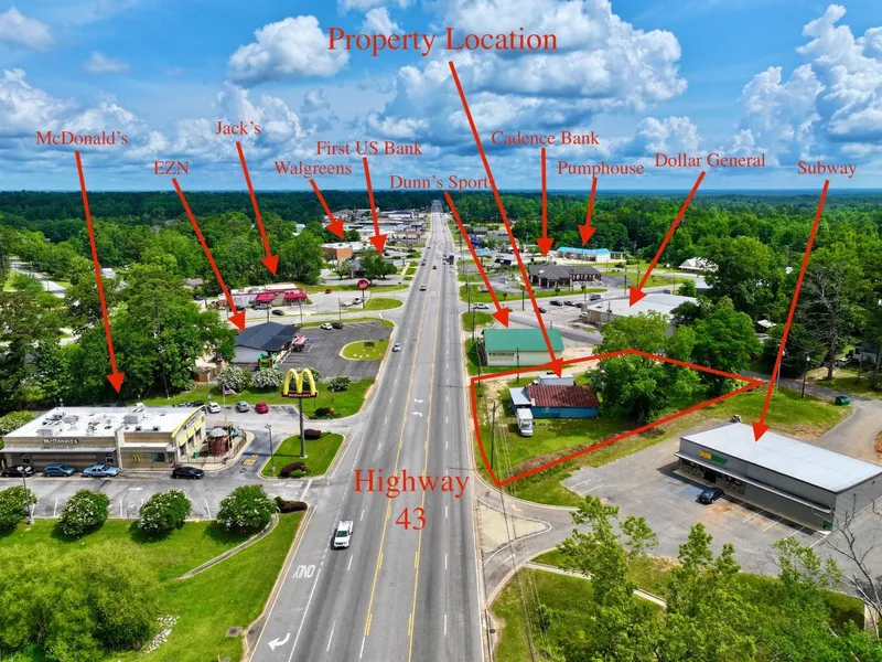 This is your chance to own one of the most visible commercial properties in Thomasville! Situated on the corner of Highway 43 and Ridgeway Street, this 0.4-acre parcel offers unmatched exposure with dual road frontage and a constant flow of traffic. Surrounded by major national retailers and local businesses-including McDonald's, Dollar General, Walgreens, Subway, and Jack's-this location is the heartbeat of Thomasville's commercial corridor. Highlights Include: • Prime visibility on Highway 43 • Road frontage on both Highway 43 & Ridgeway Street • Located between Dunn's Sports and Subway • Property includes existing structures (sold as-is) • Endless potential for redevelopment or renovation • Zoned commercial Whether you're looking to invest, redevelop, or launch your next business, this spot offers one of the best locations in town. Opportunities like this don't come often!
