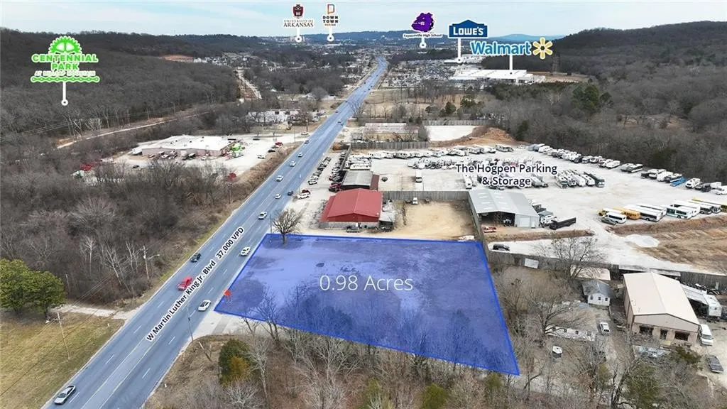 Great development potential on 0.98 acres of commercial land off bustling W Martin Luther King Jr. Blvd in Fayetteville, Arkansas. Situated between nationally recognized retail such as a Walmart Supercenter and Lowe’s. Centennial Park and future middle school campus are within a short drive as well as the University of Arkansas campus and Fayetteville High School. Location provides great convenience to commuters from Farmington and Prairie Grove and is in a direct path of growth.