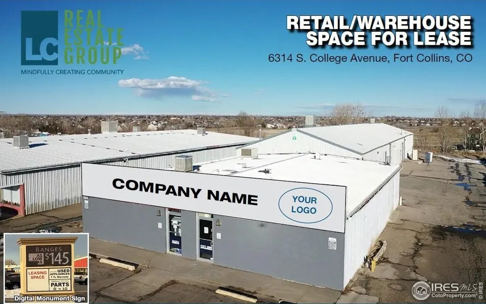 Opportunity to lease all or part of 9768 sf open retail/industrial building with Commercial General zoning in S. Fort Collins. Steel frame, metal siding and roof, with four 10'x12' overhead doors. Flexible open floorplan with front showroom/retail area, two private restrooms, rear office or storage room, six man doors, and approximately 6000 sf of open warehouse space with concrete floors. Easy access to I-25, Fort Collins, Loveland and surrounding amenities. One to three spaces available.
