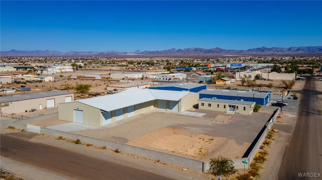 NEW BUILD ON THE MESA! 12000 SF new insulated warehouse with 6 14 ft roll up doors, 4 'Big Ass Fans' restroom shop sink and 1056 mobile office w restroom, 3 offices, drafting room and reception area. Over an acre on well with 3-phase power. Corner lot with block wall and wrought iron gates on both sides. Popular Mohave Mesa location 2 blocks off Highway 95. Room for what you need and CMO zoning to park your equipment inside and out! Office has HVAC, fans on electronic timers cool the warehouse. NO SELLER OR LEASE TERMS!
